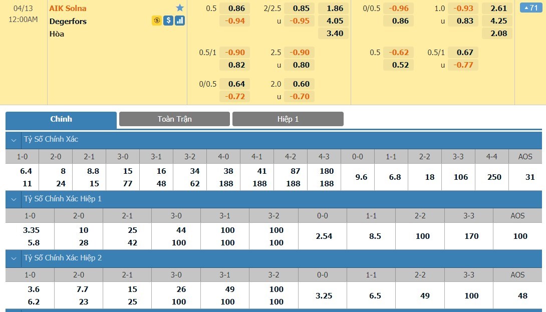 Tỷ lệ kèo cá cược bóng đá trận AIK vs Degerfors