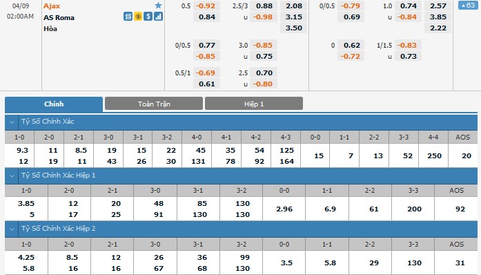 Xem tỉ lệ kèo cá cược bóng đá trực tuyến Ajax vs AS Roma