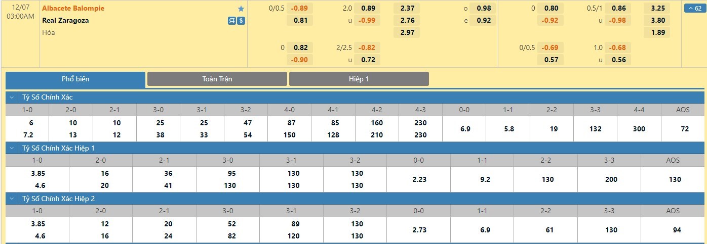 Tỷ lệ kèo cá cược bóng đá trận Albacete vs Real Zaragoza