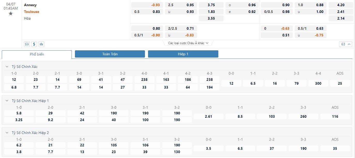 Tỷ lệ kèo cá cược bóng đá trực tuyến trận Annecy vs Toulouse