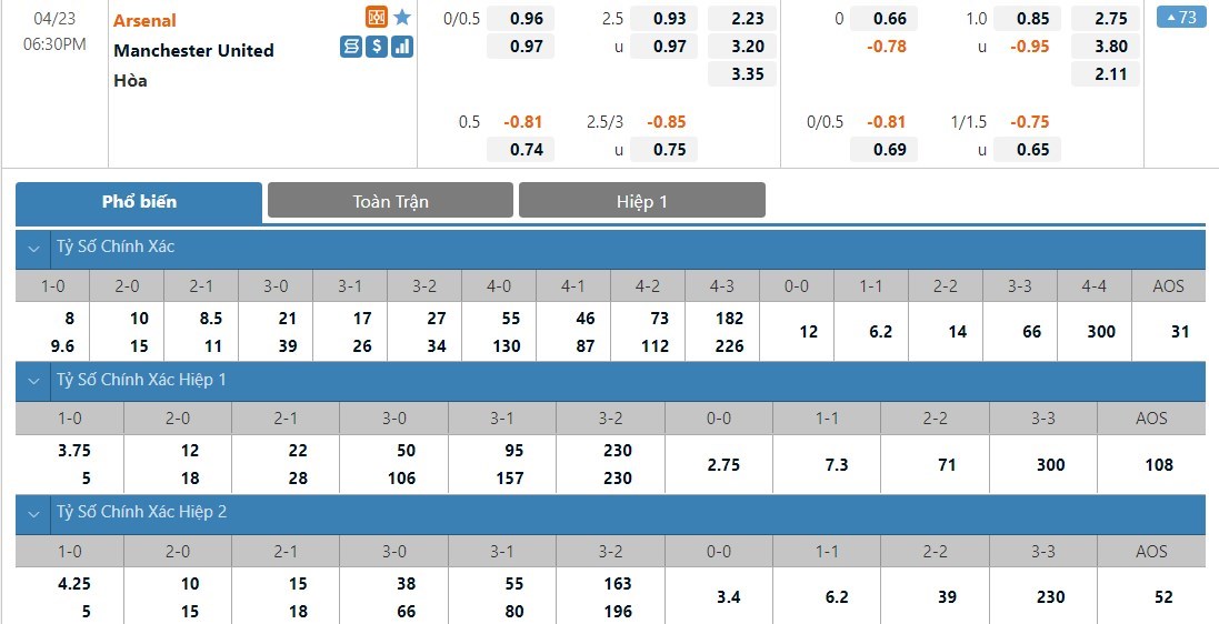 Xem tỷ lệ kèo cá cược bóng đá trực tuyến Arsenal vs Manchester United