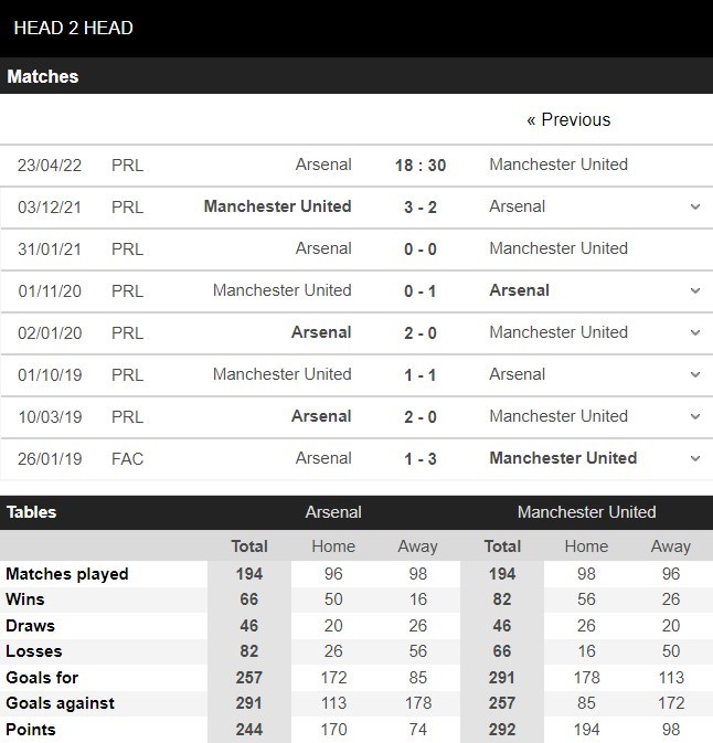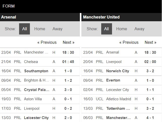 Ở 5 lần gần nhất hai đội đụng độ nhau, Arsenal là đội có thành tích tốt hơn khi đem về 2 chiến thắng trong khi Man United chỉ có 1 lần làm được điều này, còn lại là 2 trận hòa. Tuy nhiên ở trận đấu lượt đi, Quỷ Đỏ là đội bóng có được cho mình màn lội ngược dòng ấn tượng với tỉ số 3-2. Tuy nhiên với khả năng tận dụng cơ hội khá tệ của đôi bên trong giai đoạn gần đây thì khả năng nổ Xỉu đang được tin tưởng hơn.