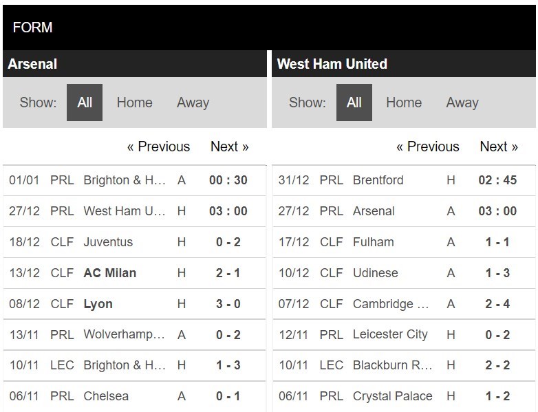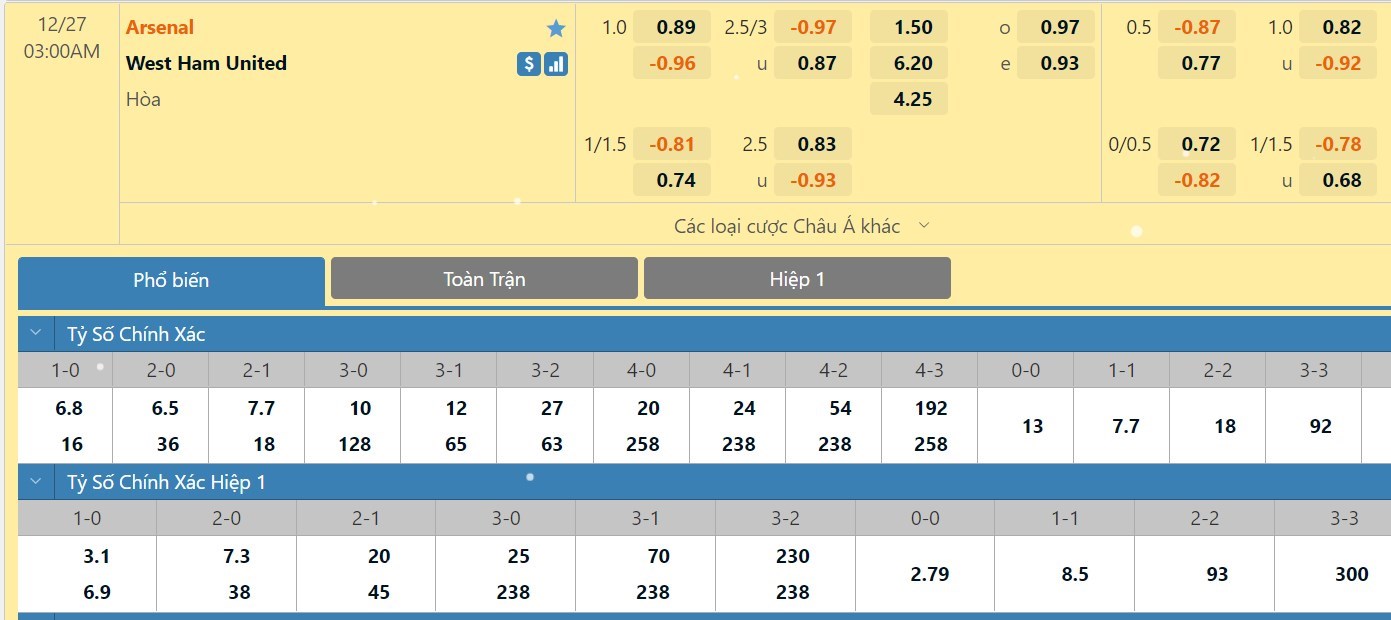 Xem tỷ lệ kèo cá cược bóng đá trực tuyến Arsenal vs West Ham