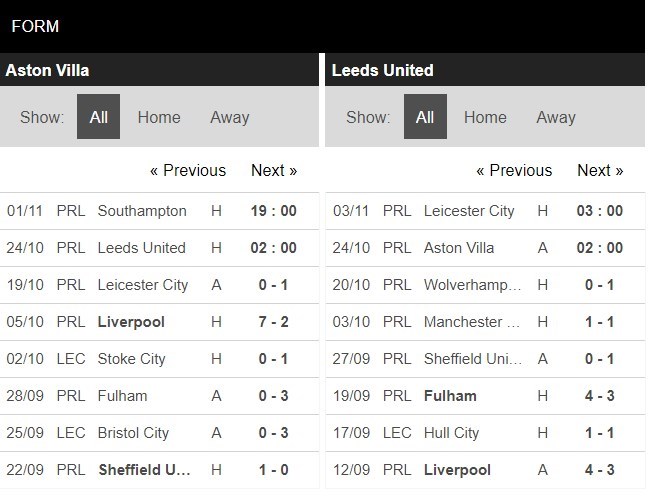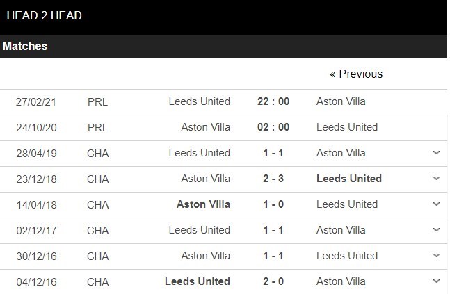 5 lần chạm trán gần đây nhất giữa Aston Villa và Leeds, mỗi bên có 1 thắng, 1 thua và 3 trận hoà. Aston Villa đang khai thác vô cùng tốt lợi thế sân nhà của mình khi mà họ thắng 4 trong 5 cuộc đấu gần đây nhất tại Villa Park. Trong khi đó, ở Premier League năm nay, Leeds thắng 1 và thua 1 ở sân khách. Thất bại đó là tại Anfield và với tỷ số 3-4 đầy kịch tính dưới tay nhà đương kim vô địch Liverpool. Khi mà Aston Villa vẫn đang tiếp tục bay cao thì việc người chơi lựa chọn đội bóng này với mốc chấp -1/4 vẫn là sự lựa chọn an toàn.