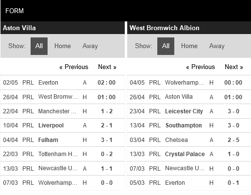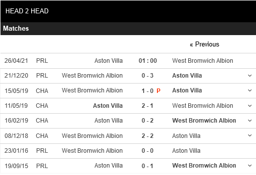 Thống kê đối đầu Aston Villa vs West Bromwich