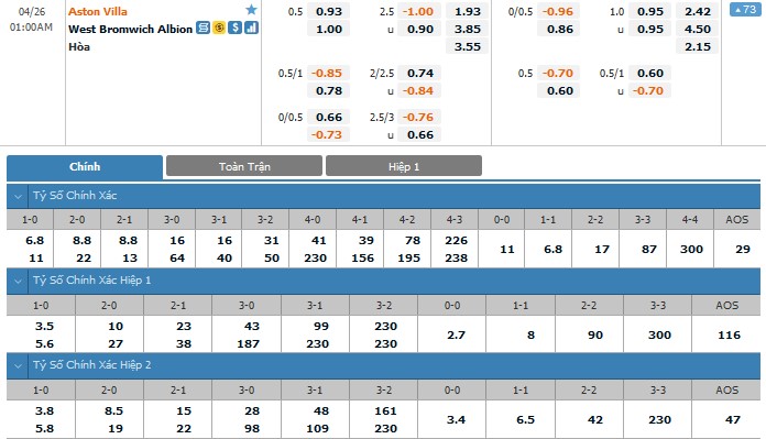 Chu kỳ lên xuống tỉ lệ kèo Aston Villa vs West Bromwich