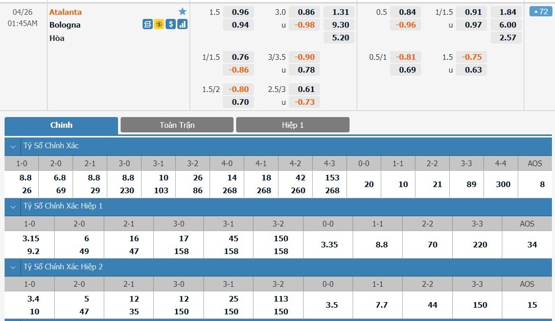 Tỷ lệ kèo cá cược bóng đá trực tuyến trận Atalanta vs Bologna