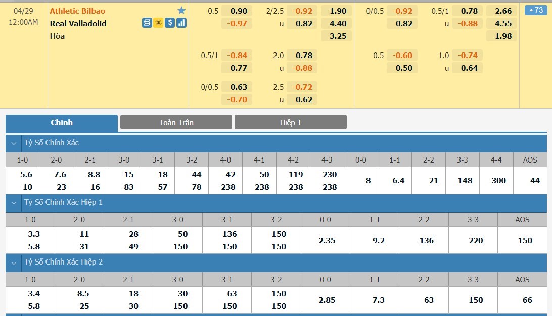 Xem tỷ lệ kèo cá cược bóng đá trực tuyến Athletic Bilbao vs Real Valladolid