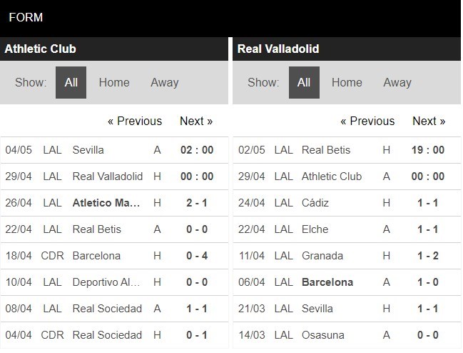 Thống kê đối đầu Athletic Bilbao vs Real Valladolid