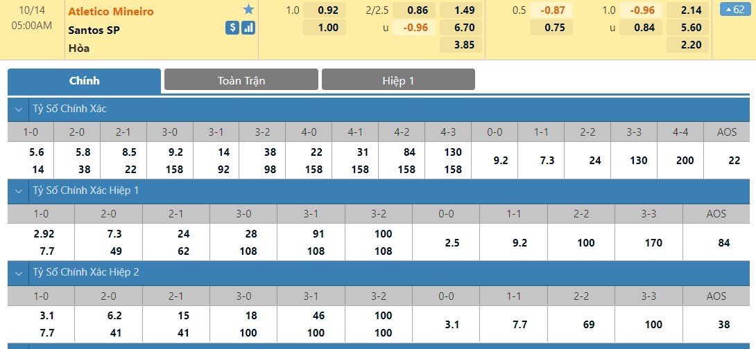 Tỷ lệ kèo cá cược bóng đá trận Atletico MG vs Santos FC