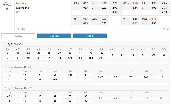 Xem tỷ lệ kèo cá cược bóng đá trực tuyến Barcelona vs Real Madrid