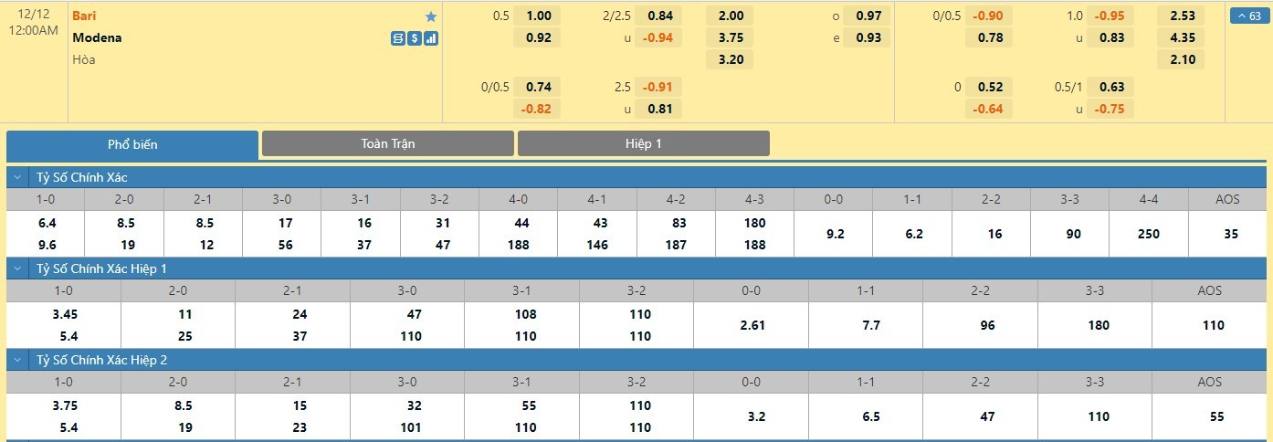 Tỷ lệ kèo cá cược bóng đá trực tuyến trận Bari vs Modena