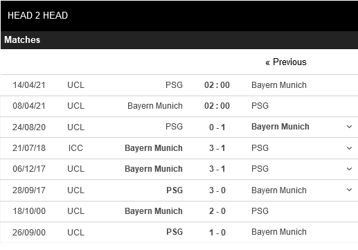 Thống kê đối đầu Bayern Munich vs Paris Saint-Germain
