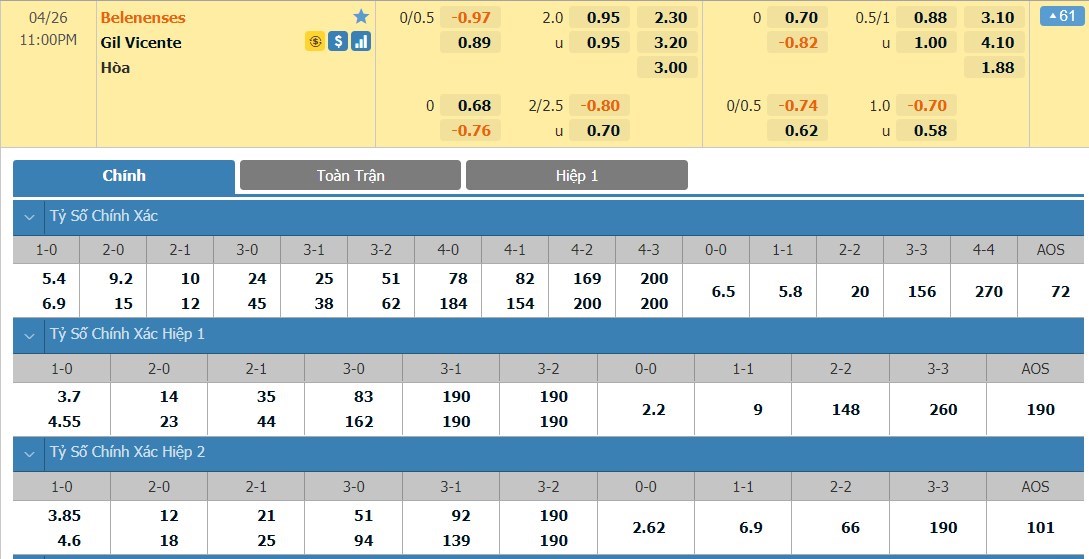Tỷ lệ kèo cá cược bóng đá trận Belenenses vs Gil Vicente