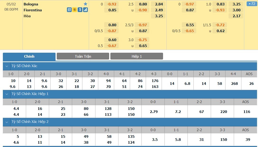 Tỷ lệ kèo cá cược bóng đá trận Bologna vs Fiorentina