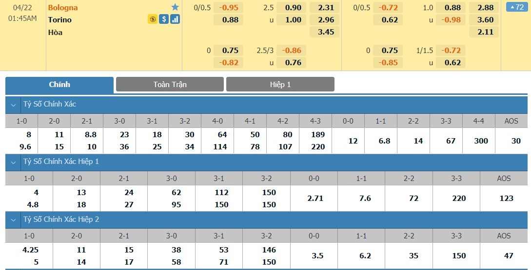 Tỷ lệ kèo cá cược bóng đá trận Bologna vs Torino