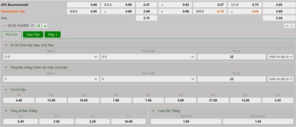 Xem tỷ lệ kèo cá cược bóng đá trực tuyến Bournemouth vs Manchester City