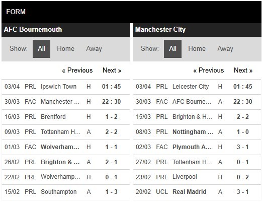 Thống kê phong độ Bournemouth vs Manchester City