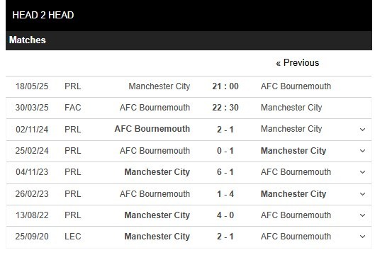 Thống kê đối đầu Bournemouth vs Manchester City