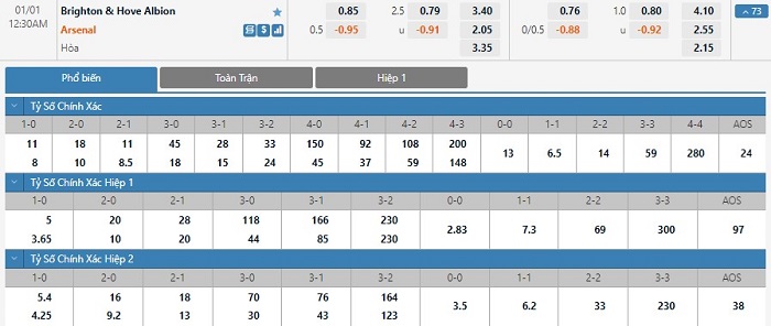 Xem tỷ lệ kèo cá cược bóng đá trực tuyến Brighton vs Arsenal