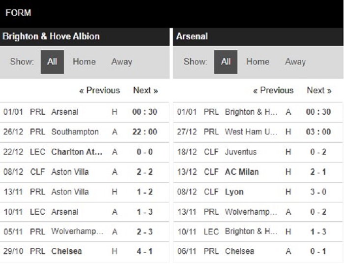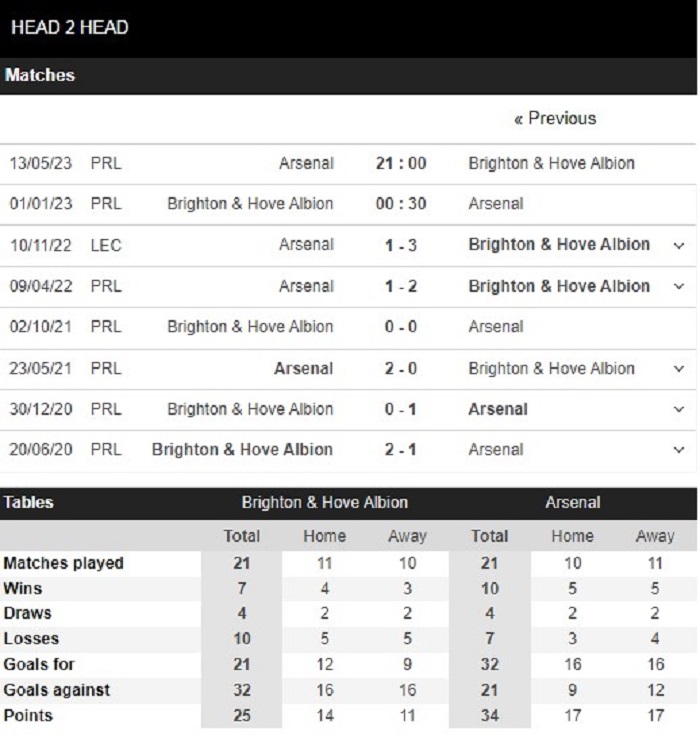 Thống kê đối đầu Brighton vs Arsenal