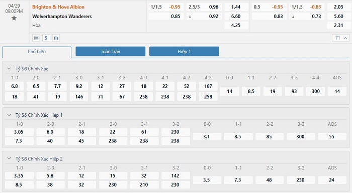 Tỷ lệ kèo cá cược bóng đá trực tuyến trận Brighton vs Wolverhampton