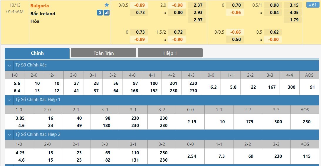 Tỷ lệ kèo cá cược bóng đá trận Bulgaria vs Bắc Ireland