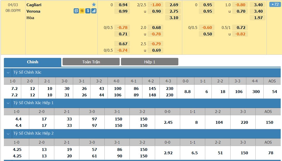 Tỷ lệ kèo cá cược bóng đá trận Cagliari vs Hellas Verona