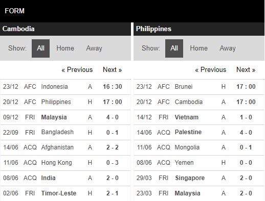 Trong 2 lần chạm trán gần nhất giữa hai đội, Campuchia đều phải nhận thất bại dưới tay Philippines. Thực tế thì phong độ của Campuchia trước khi bước vào giải đấu lần này cũng là không mấy tích cực. Họ đã để thua trong cả 2 trận giao hữu gần nhất gặp Bangladesh và Malaysia. Đáng nói là trong cả 2 trận thua kể trên, các cầu thủ Campuchia đều bất lực trong việc tìm kiếm bàn thắng.