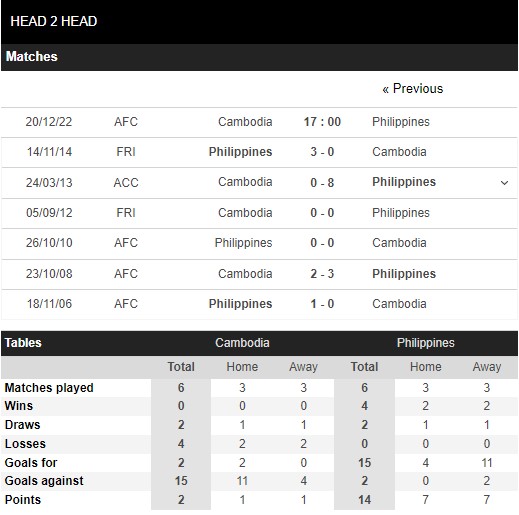 Thống kê phong độ Campuchia vs Philippines