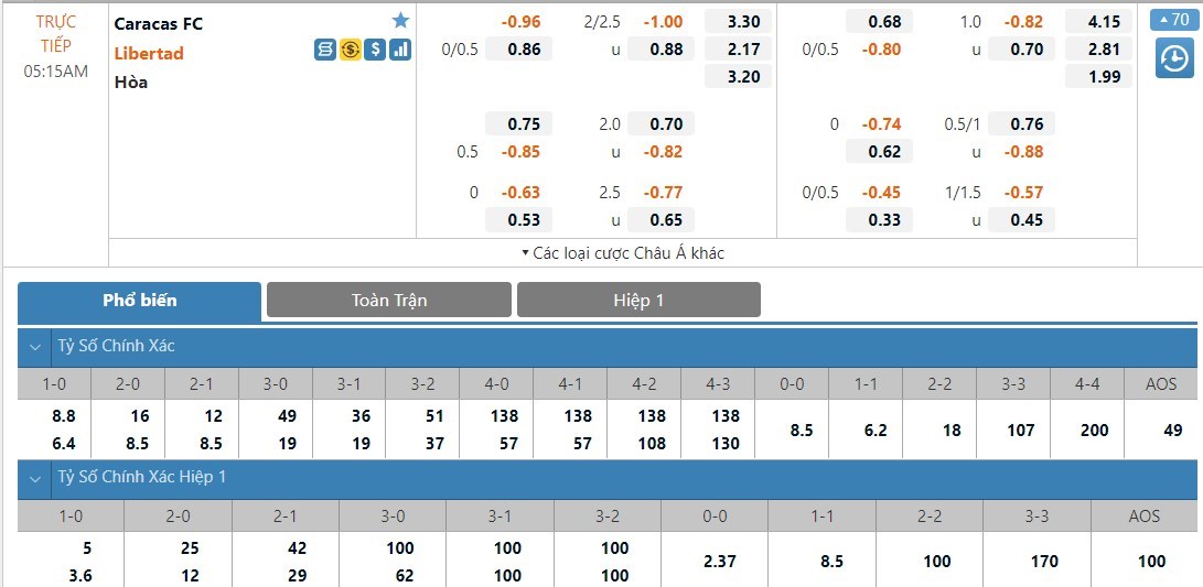 Tỷ lệ kèo cá cược bóng đá trực tuyến trận Caracas vs Libertad Asuncion