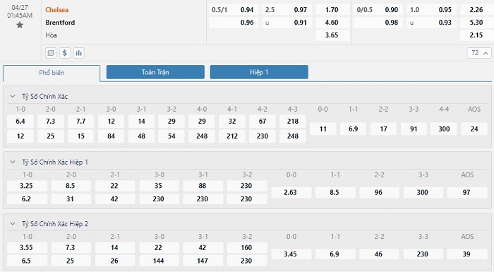 Tỷ lệ kèo cá cược bóng đá trực tuyến trận Chelsea vs Brentford