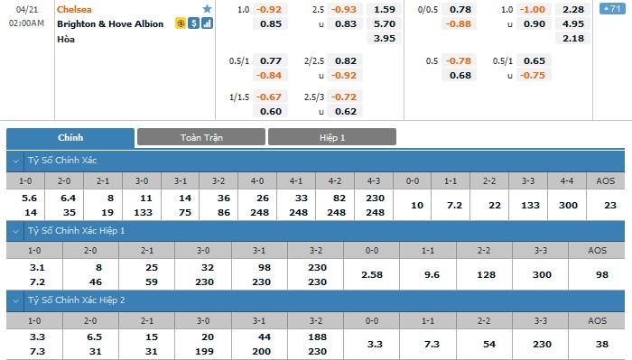 Xem tỉ lệ kèo cá cược bóng đá trực tuyến Chelsea vs Brighton