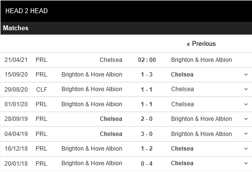 Trong khi đó, Brighton vẫn luôn thể hiện lối đá dè dặt trước các đội bóng trong nhóm Big Six. Mùa này, họ chỉ có đúng 1 lần ghi được 2 bàn thắng trước Big Six là ở trận thua 2-3 trước Man United từ tháng 9 năm ngoái. Và có thể tin vào một lối chơi cẩn thận tương tự khi làm khách của Chelsea.
