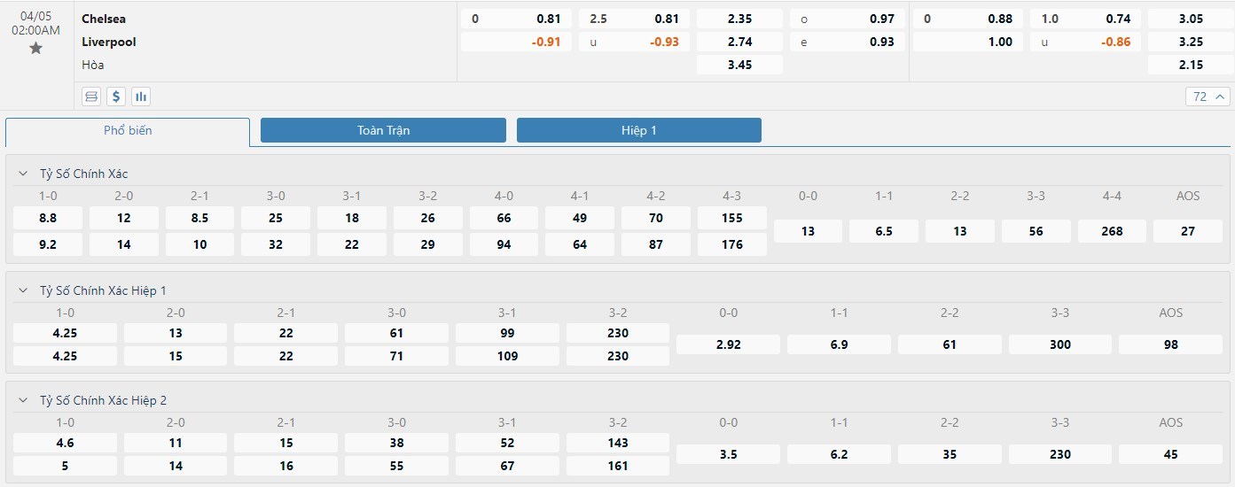 Xem tỷ lệ kèo cá cược bóng đá trực tuyến Chelsea vs Liverpool