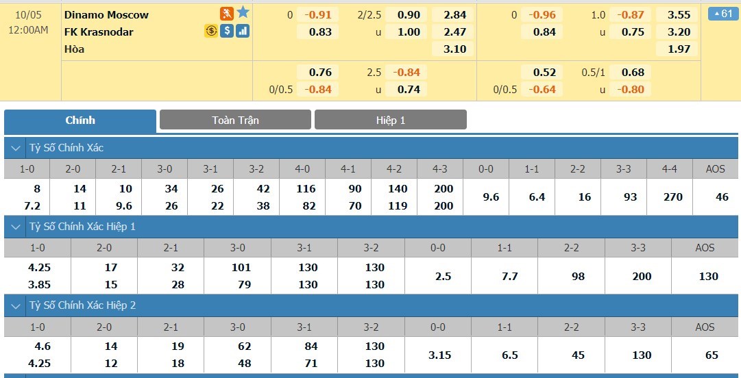 Tỷ lệ kèo cá cược bóng đá trận Dinamo Moscow vs FC Krasnodar