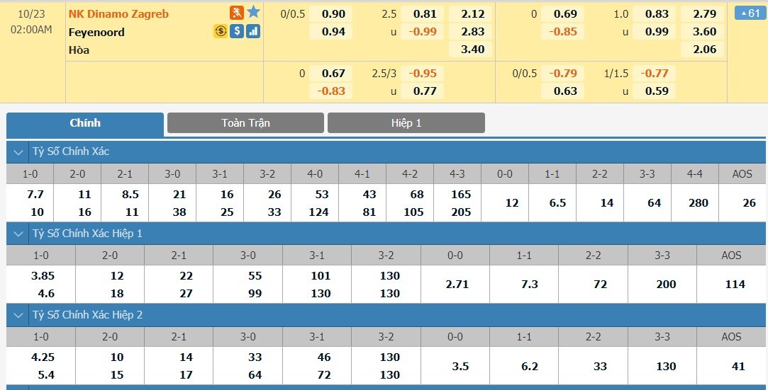 Tỷ lệ kèo cá cược bóng đá trận Dinamo Zagreb vs Feyenoord