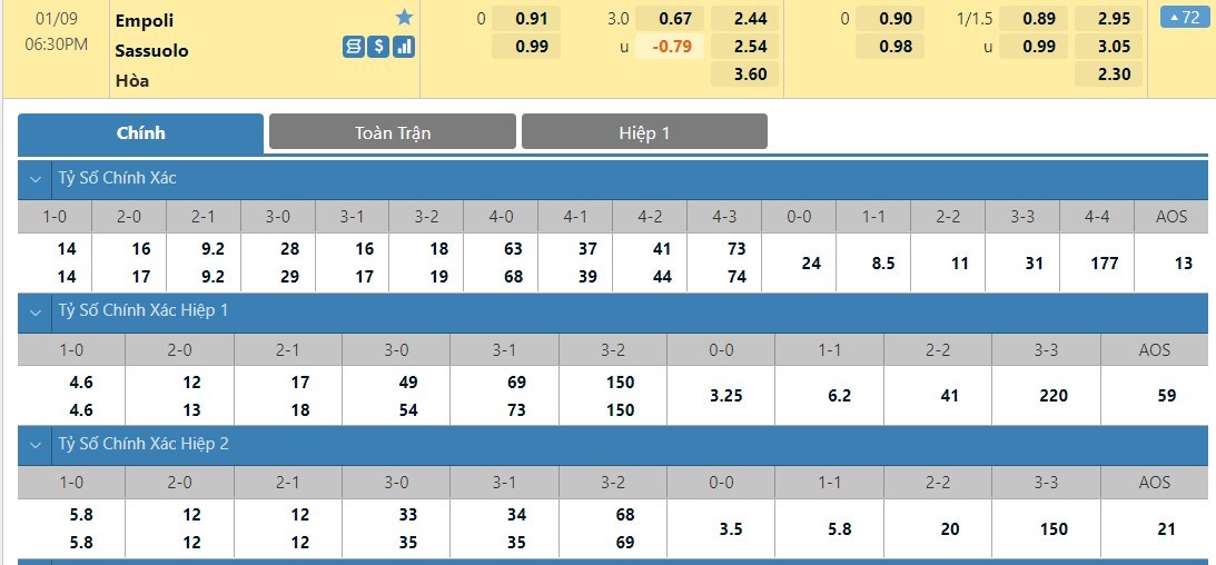 Tỷ lệ kèo cá cược bóng đá trận Empoli vs Sassuolo