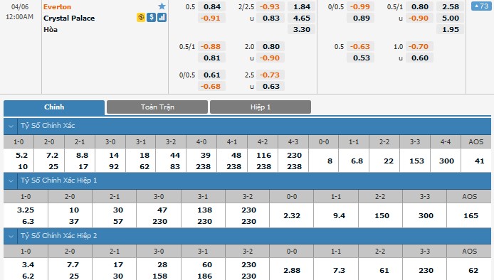 Xem tỉ lệ kèo cá cược bóng đá trực tuyến Everton vs Crystal Palace