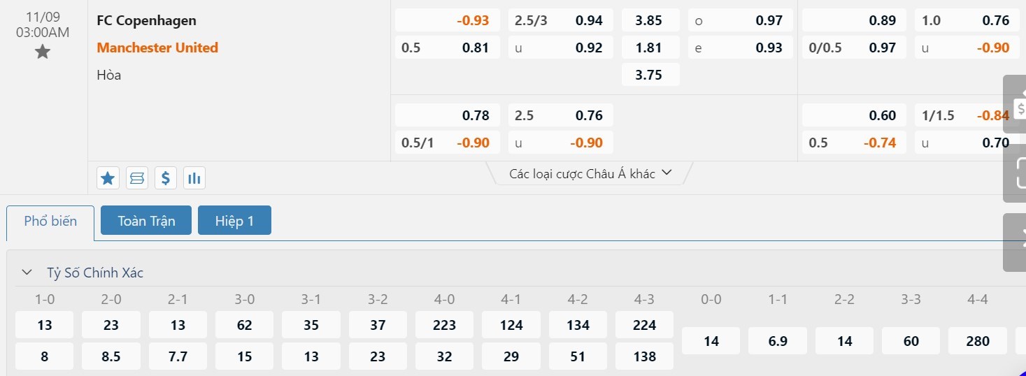 Tỷ lệ kèo cá cược bóng đá trực tuyến trận FC Copenhagen vs Manchester United