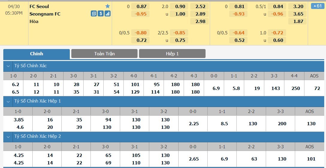 Tỷ lệ kèo cá cược bóng đá trực tuyến trận FC Seoul vs Seongnam FC