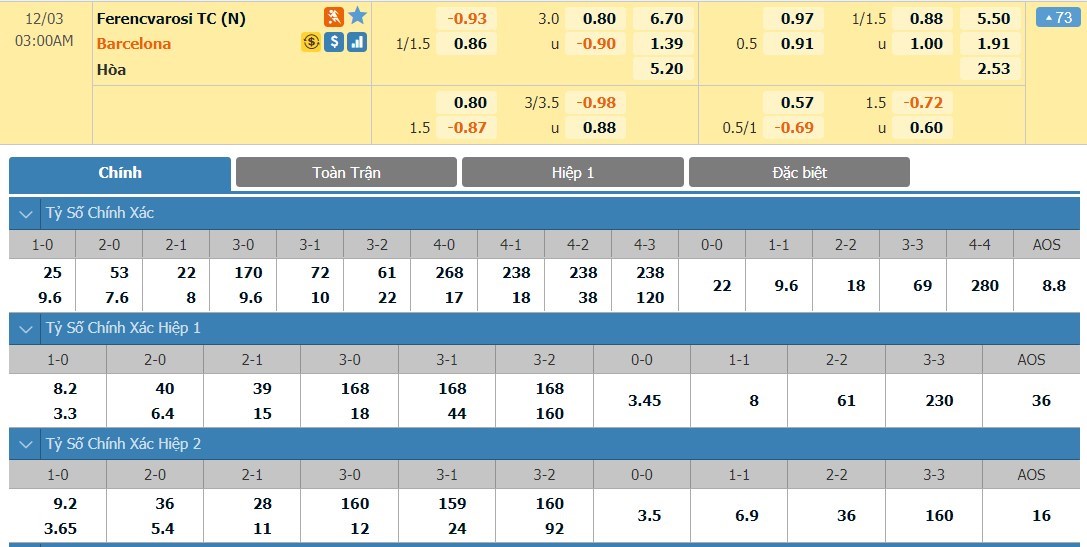 Tỷ lệ kèo cá cược bóng đá trực tuyến trận Ferencvaros vs Barcelona