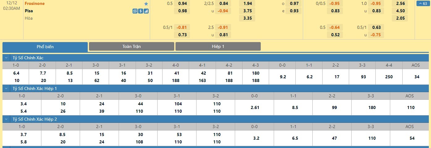 Tỷ lệ kèo cá cược bóng đá trận Frosinone vs Pisa