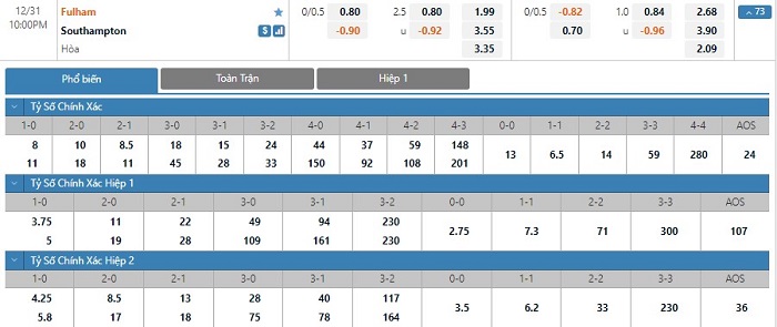 Trong 5 trận đấu gần nhất trên mọi đấu trường, Fulham đã mang về cho mình 6 pha lập công cùng với 5 lần phải vào lưới nhặt bóng. Bên kia chiến tuyến, Southampton đã sở hữu 6 bàn thắng, còn lại là việc hàng thủ đã phải nhận 12 bàn thua. Ở 5 lần gần nhất hai đội bóng này đối đầu nhau thì đã có 2 trận đấu kết thúc với tổng số bàn thắng từ 3 trở lên. Các nhà đầu tư nên tin tưởng vào khả năng nổ Tài ở cuộc đối đầu này với tỷ lệ tài xỉu là 2 1/2 trái.