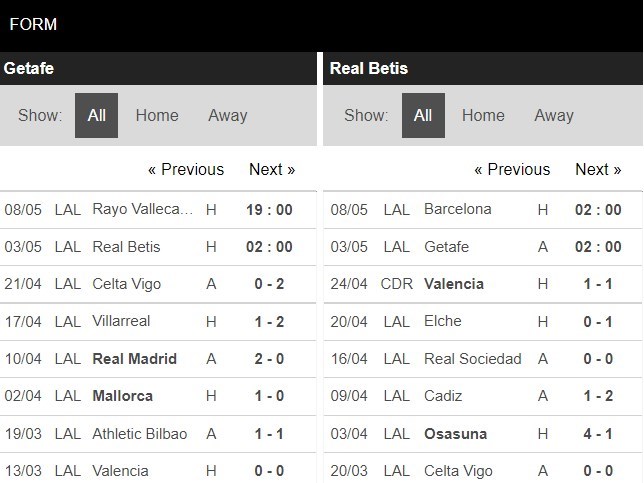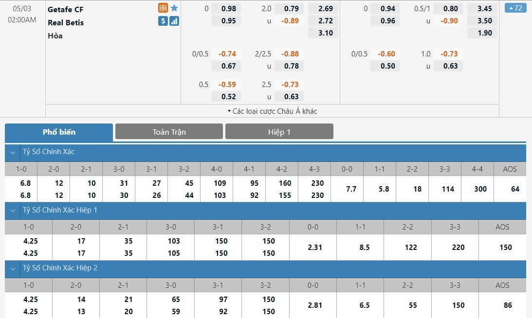 Xem tỷ lệ kèo cá cược bóng đá trực tuyến Getafe vs Real Betis