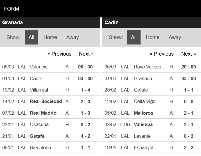 Granada đạt thành tích tương đối tốt trong hiệp 1 mùa này với 7 chiến thắng và 9 trận hòa. Trong khi đó, Cadiz có 6 chiến thắng 10 trận hòa trong hiệp đấu đầu tiên.