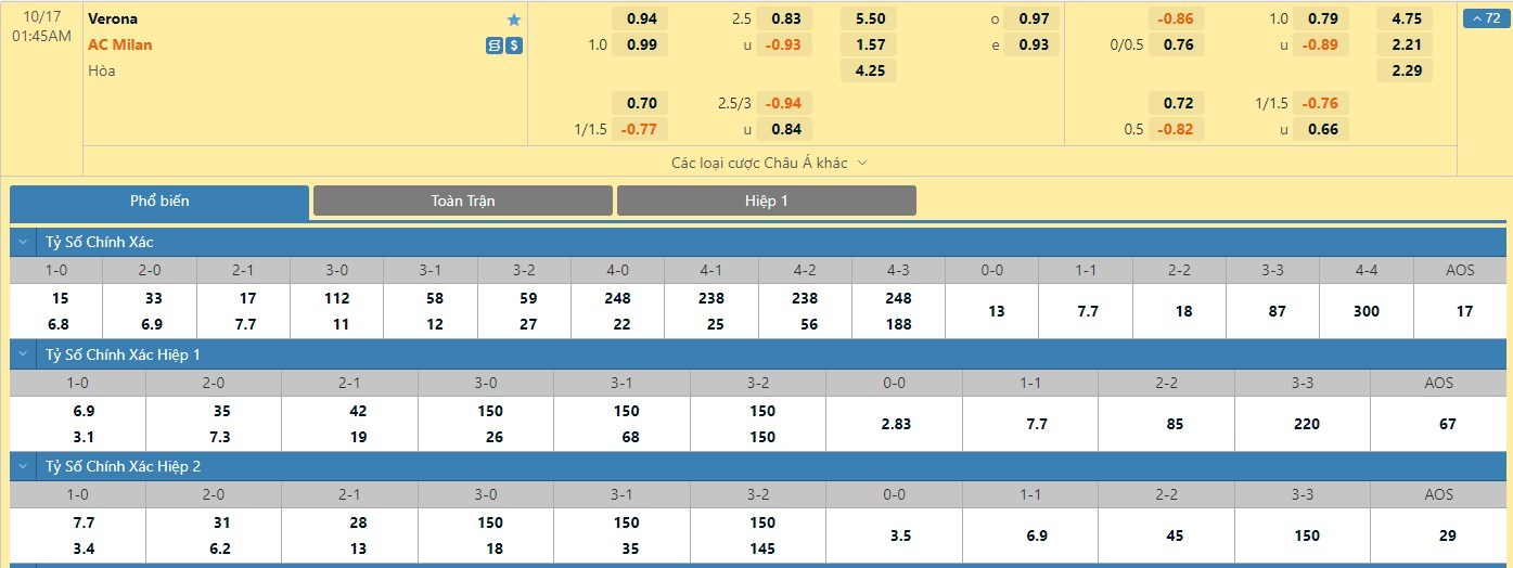 Xem tỷ lệ kèo cá cược bóng đá trực tuyến Hellas Verona vs AC Milan