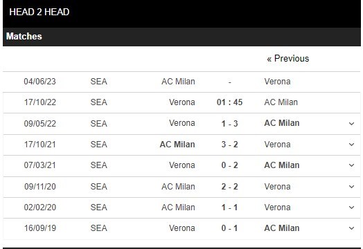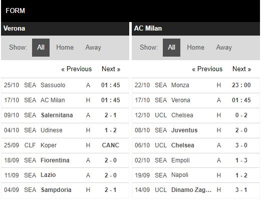 Ở 5 trận đấu gần đây giữa 2 đội, Verona đang là đội bóng có cho mình lợi thế với 2 lần vươn lên dẫn trước, 1 lần bị đối thủ của mình vượt mặt và 2 lần bất phân thắng bại sau 45 phút đầu tiên. Hàng thủ của Hellas Verona đang thi đấu vô cùng hớ hênh ở 45 phút đầu tiên với 3/5 trận đấu gần nhất không thể giữ sạch lưới. Trong khi đó, hàng công của AC Milan cũng đang gặp vấn đề lớn với 4/5 trận đấu gần nhất không thể khai thông thế bế tắc sau hiệp 1.