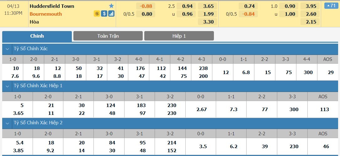 Tỷ lệ kèo cá cược bóng đá trực tuyến trận Huddersfield vs Bournemouth
