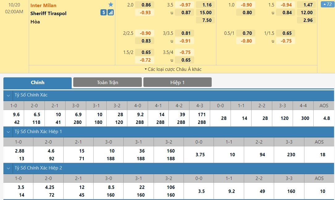 Tỷ lệ kèo cá cược bóng đá trực tuyến trận Inter Milan vs Sheriff Tiraspol